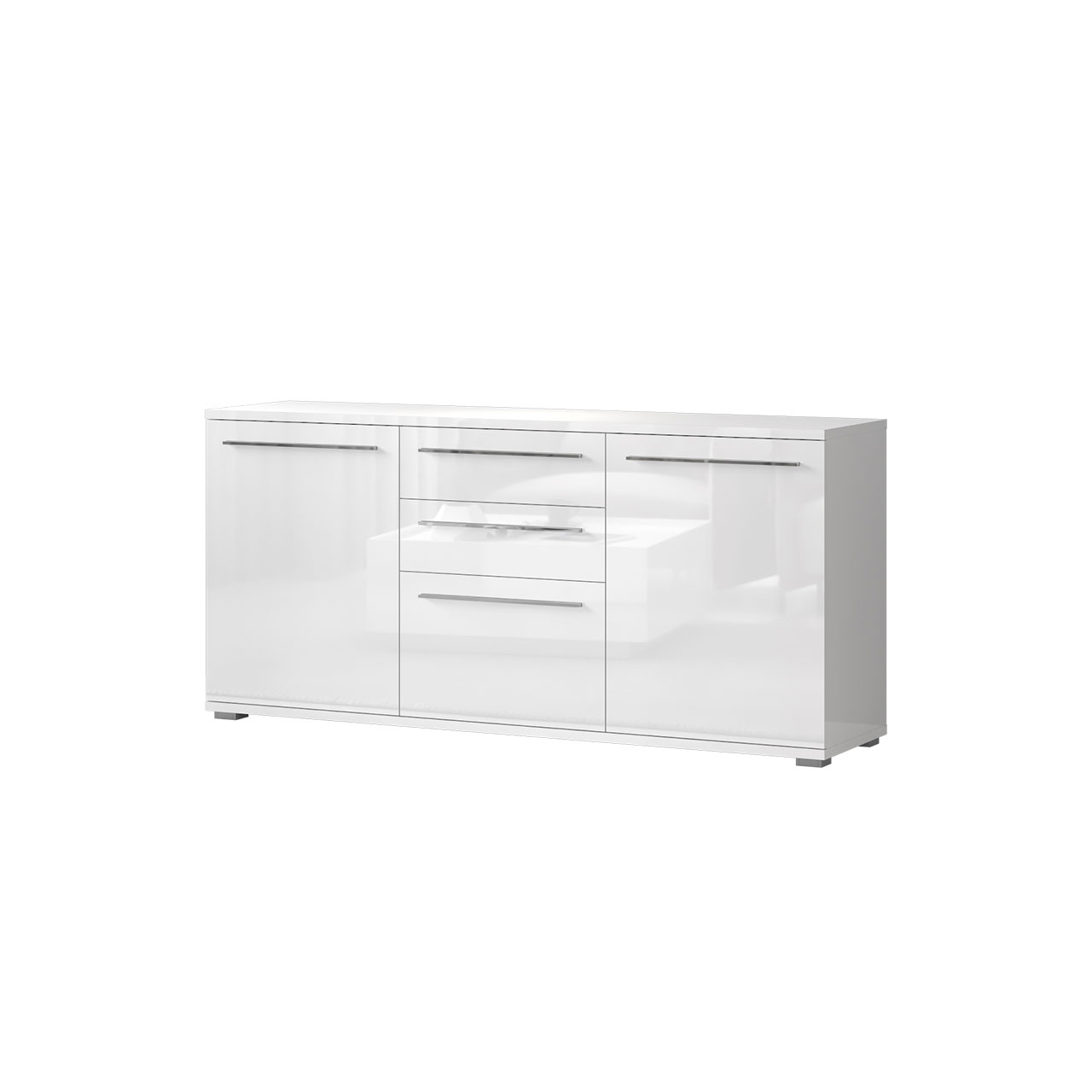 Bež lak / Bež Lak Funkcionalna komoda iz kolekcije nameštaja PIANO sa tri puna krila I dve fioke, dizajnirane geometrijske forme.
