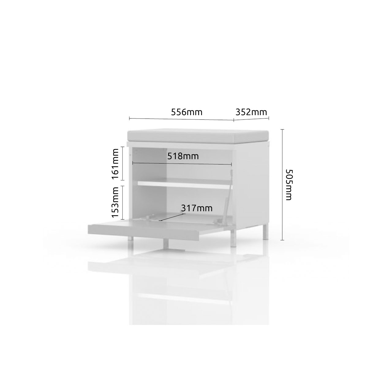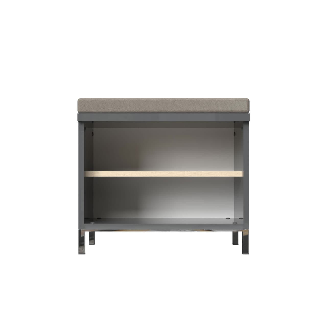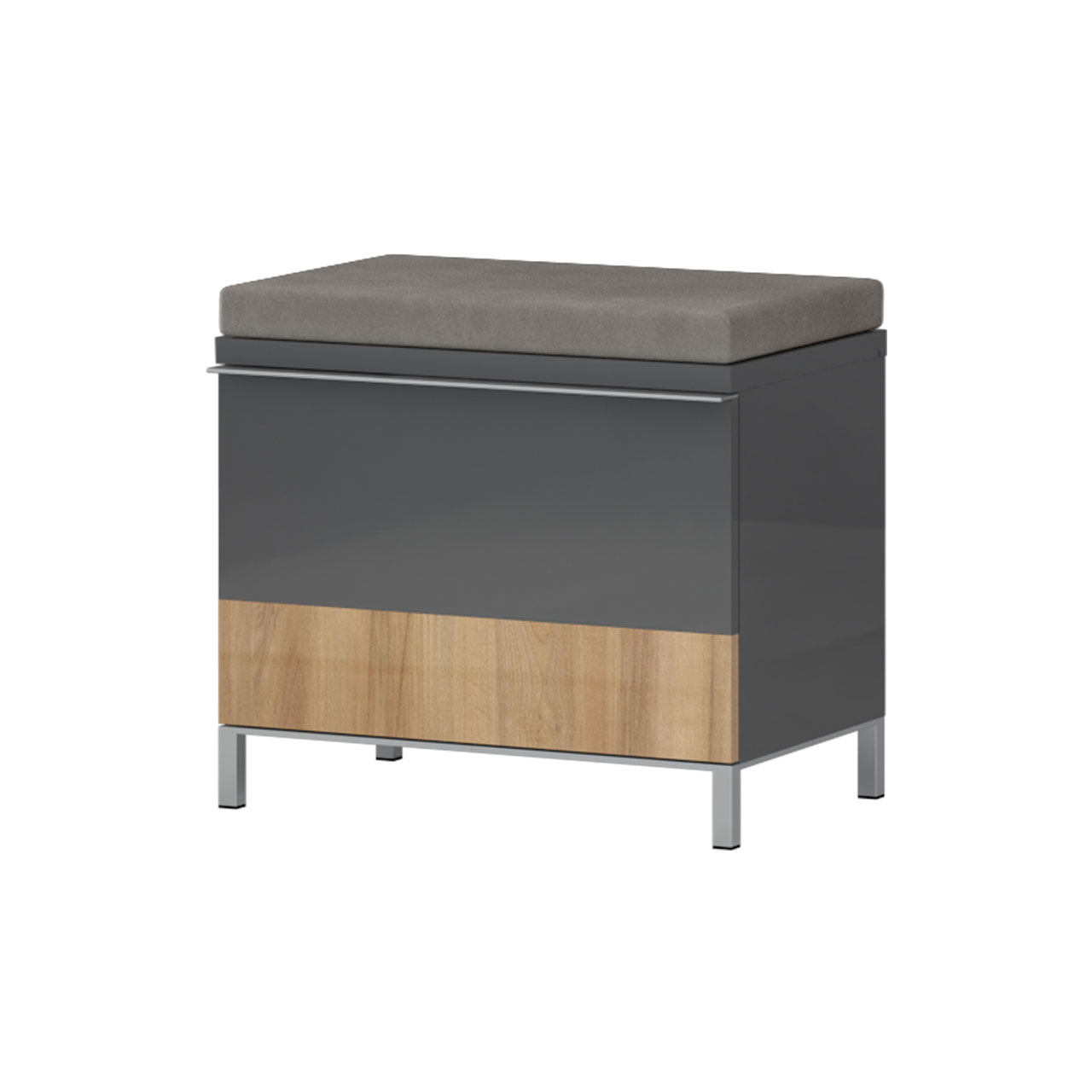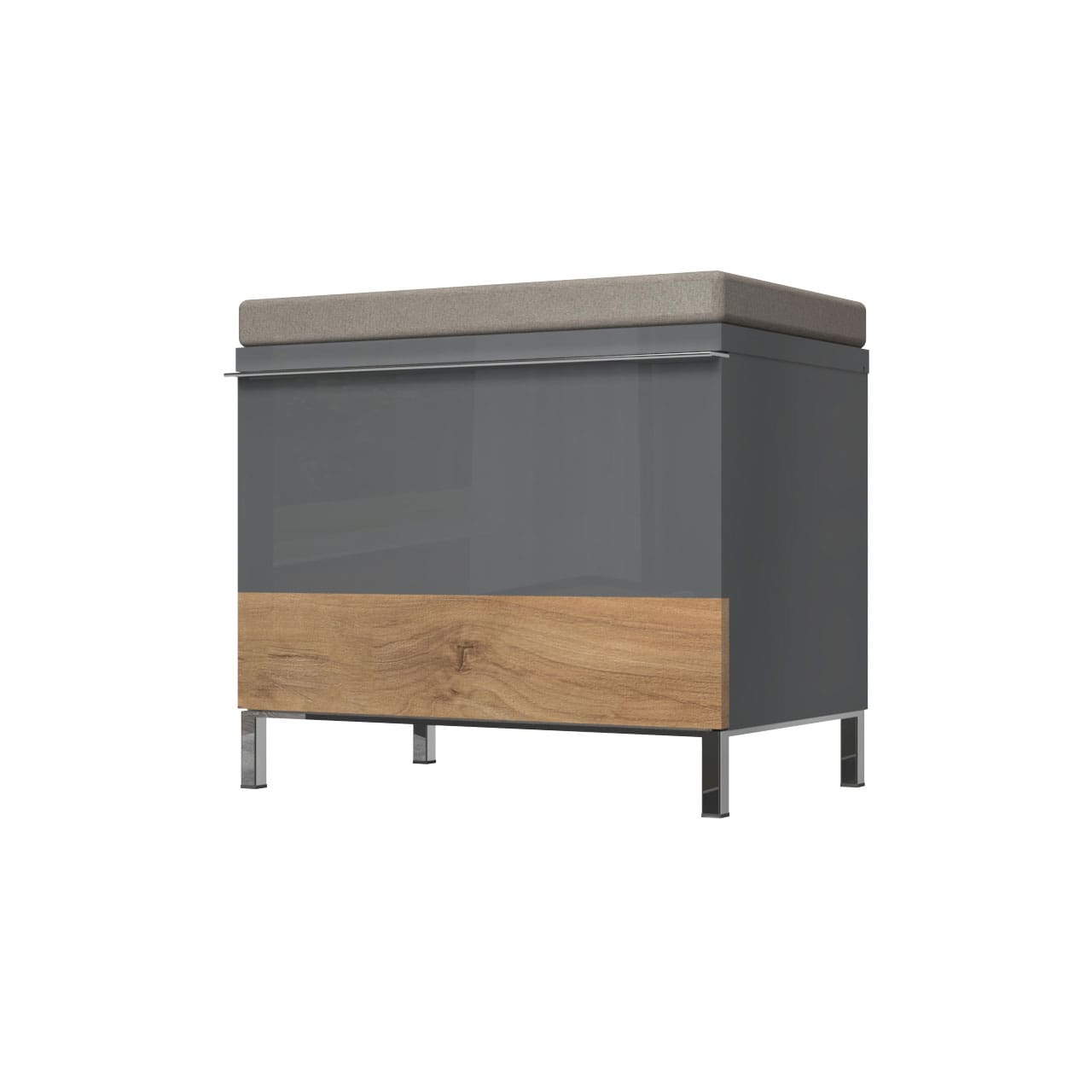 Komoda sa jednim krilom i tapaciranim jastukom za sedenje.
